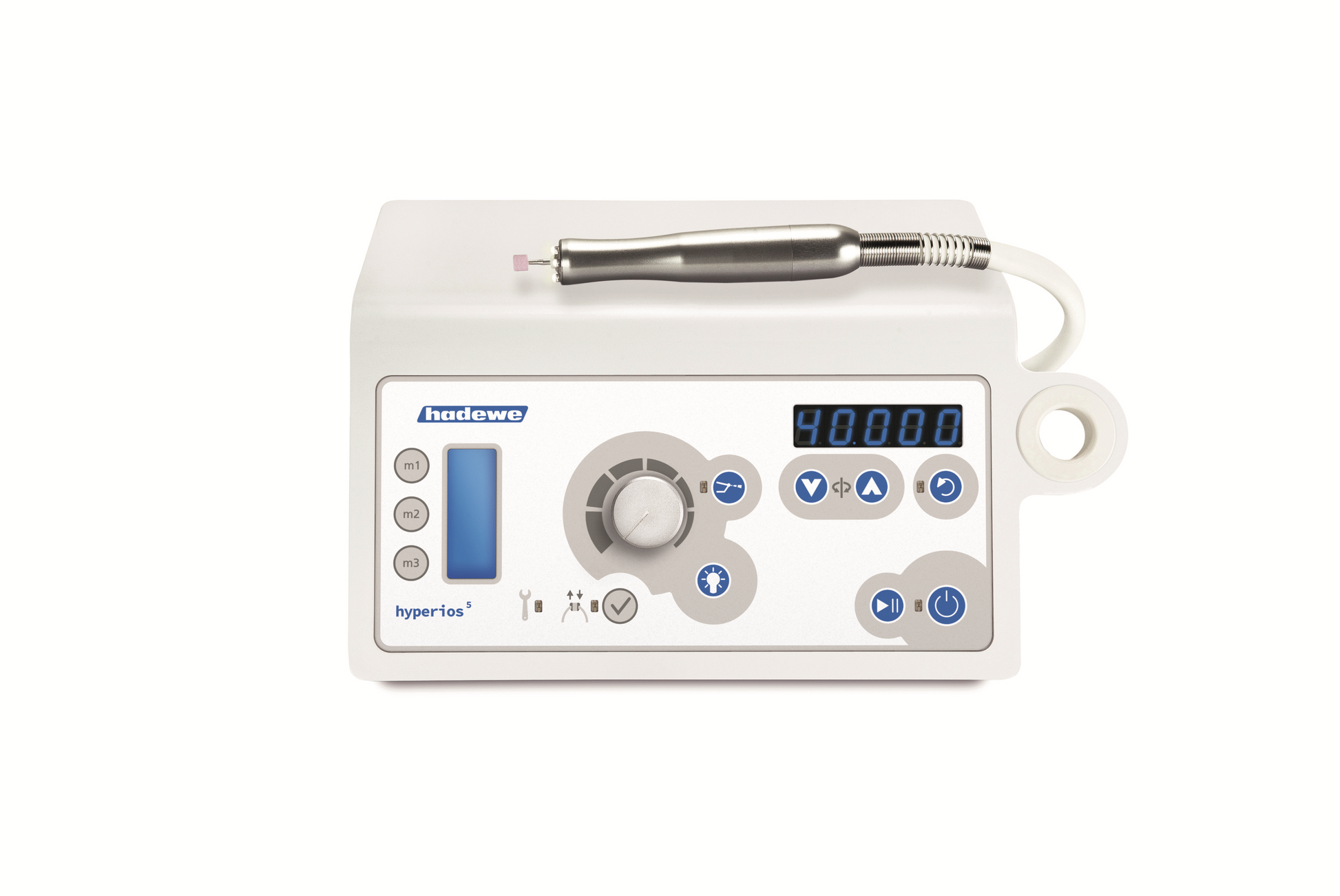 De Hadewe Hyperios 5 Chrome is de opvolger van het bekende model Hadewe Hyperios 4 Chrome. Het handstuk is koolborstelloos en traploos instelbaar tot 40.000 toeren. De machine is uitgerust met enkele extra functies waaronder een pauzefunctie en een automatisch reinigingssysteem. Het spraysysteem werkt op gedemineraliseerd water en het tankje is uitneembaar. Dit model is tevens voorzien van tip-toetsen, waardoor de machine gemakkelijk te reinigen is. Met de spoelfunctie kunt u huid- en nagelresten van de behandelplaats spoelen.