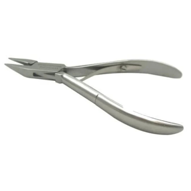 De knipkop van deze nagelhoektang is afgewerkt als ronde vlakken. Hierdoor is er minder risico op scherpe drukplekken bij het aanleggen van de tang vóór de knipactie. Het ronde vlak zorgt echter ook voor een iets moeilijkere positionering, je mist immers het platte steunvlak dat de rechte hoekkniptang biedt bij het aanleggen van de tang onder de nagelhoek. De tangen zijn ca. 128mm lang. De knipkop is gesmeed en doorgestoken.