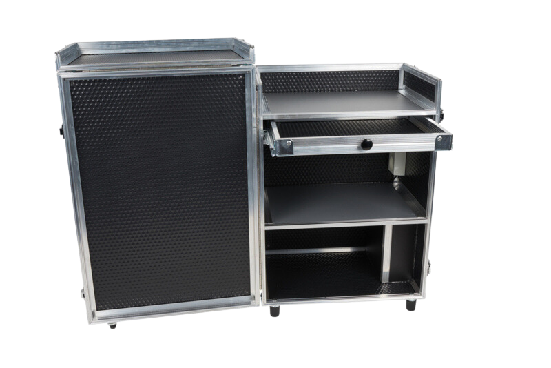 De koffer is voorzien van een tweevoudig stopcontact en een oprolbaar snoer met een lengte van 5 meter. Verder beschikt de koffer over een handige trolleygreep dat tevens de plaats is voor de beensteun. Met grote zijwielen is deze koffer moeiteloos te verrijden. De koffer is gemaakt van kunststof en voorzien van 4 sloten. De koffer is voorzien van een instrumentenlade, waar u gemakkelijk en overzichtelijk uw instrumenten in kunt opbergen. De koffer is als de Veron maar dan nu als extra een lade onder de bovenste plank. Deze koffer is 5 cm dieper dan de Veron met instrumentenlade.
