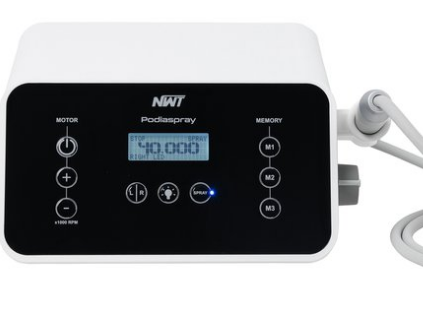 De PodiaSpray is uitgerust met een toetsenbord met numeriek display. Eenvoudig en intuïtief, en zeer gemakkelijk te reinigen met een desinfecterend doekje, voor een perfecte en hygiënische werkomgeving. De PodiaSpray NWT NT100 is uitgerust met licht. De motor is uitgerust met een krachtige, stille en koolborstelloze micromotor. Het klemsysteem vereenvoudigt het dagelijkse werk. Het handstuk kan te allen tijde gemakkelijk in de houder aan de zijkant van het apparaat worden geplaatst zonder gevaar voor vallen.