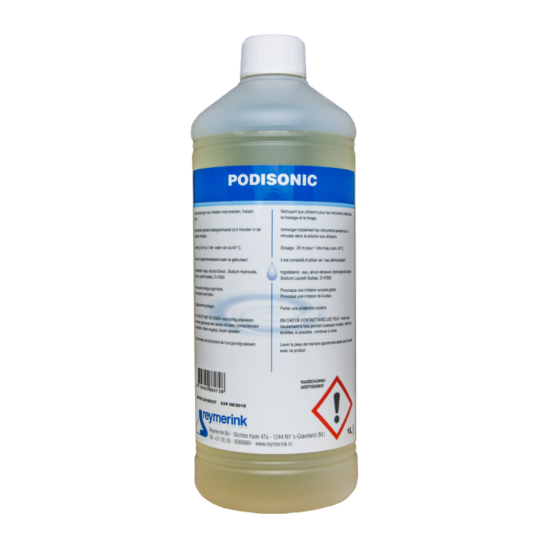 Podisonic is een reinigingsmiddel voor frezen en gereedschappen speciaal bedoeld om te gebruiken in een ultrasoon. Voor sommige gebieden met hard water is het advies om i.p.v. water gedemineraliseerd water te gebruiken. Plaats de frezen en het gereedschap voor min. 240 sec in de ultrasoon, zet deze aan, gereedschap en frezen er uit halen en onder stromend water afspoenlen, laat voor gebruik alles weer aan de lucht drogen.