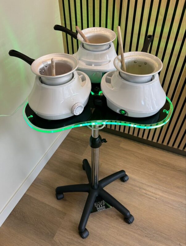 Een prachtige, verrijdbare Docking Station waar je drie verschillende waxen tegelijk kunt opwarmen. Een sieraad voor je salon!